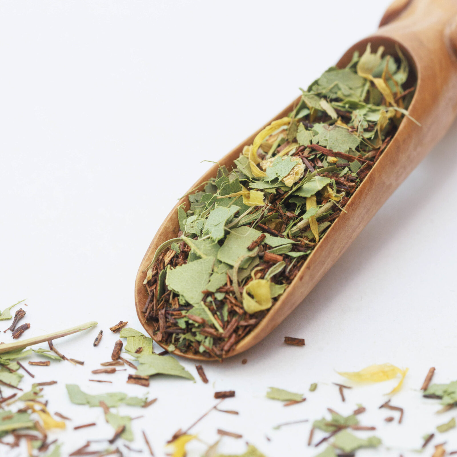 Kofeiinivaba Aafrika punane rooibos, eukalüpti lehed 22%, apelsinikoor, apelsini õied, lõhna- ja maitseaine. Sobib hästi väikelastele, rasedatele, imetavatele emadele.