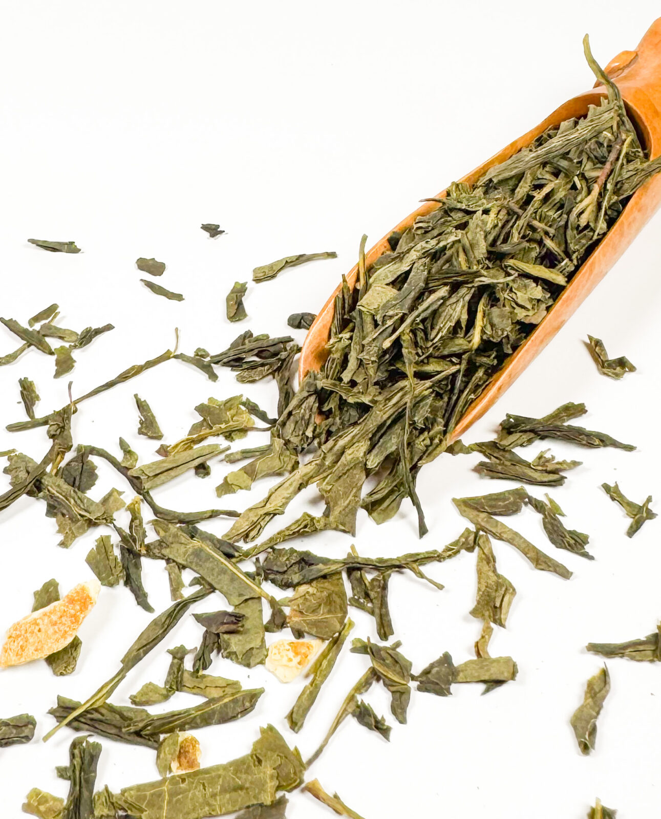 Teesegu milles roheline sencha tee*, apelsinikoor* ja apelsiniõli*.