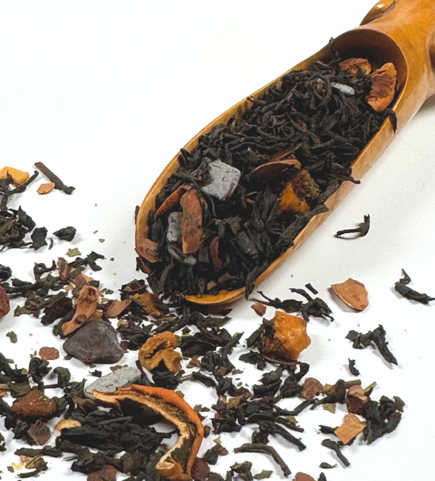 Teesegu milles must tee, õun, KAKAOoa kestad ja nibbsid, lõhna- ja maitseaine, magusa muraka lehed, valge ja tumeda šokolaadi tükikesed (suhkur, KAKAOvõi, PIIMApulber, dekstroos, SOJAletsitiin), KAKAOõli.