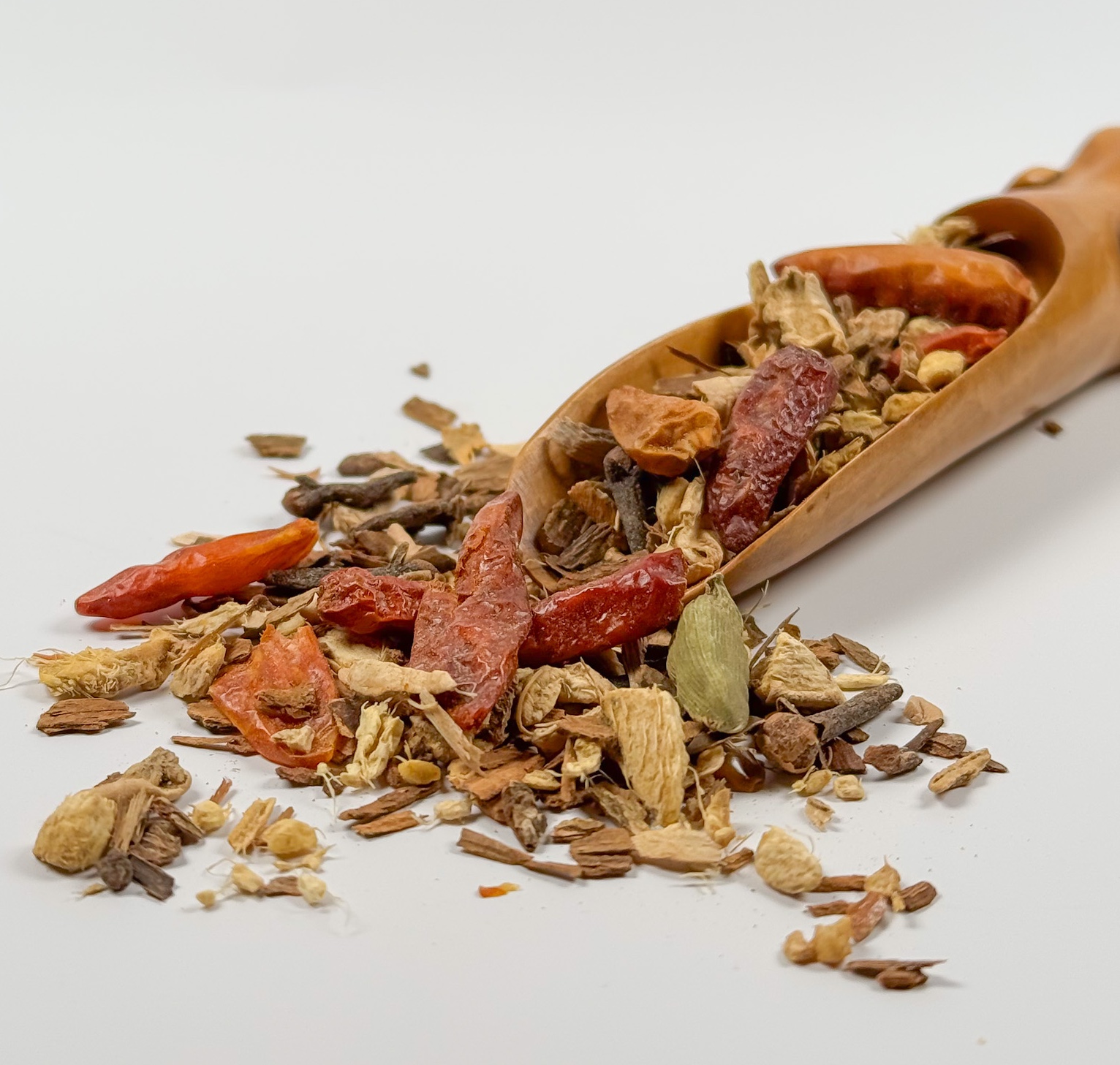 Klassikaline chai segu milles ingverijuur, kaneeli koor, kardemoni kuprad, kardemoni seemned, nelk, tähtaniis, tšillikaunad.