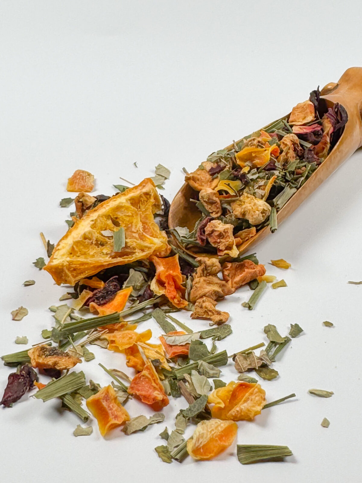Teesegu milles õuna ja punapeedi tükikesed, porgandi helbed, muraka lehed, eukalüpti lehed, hibiskuse õied, sidrunhein, külmkuivatatud mandariin ja apelsin, kuivatatud apelsini viilud, looduslik greibi lõhna- ja maitseaine.