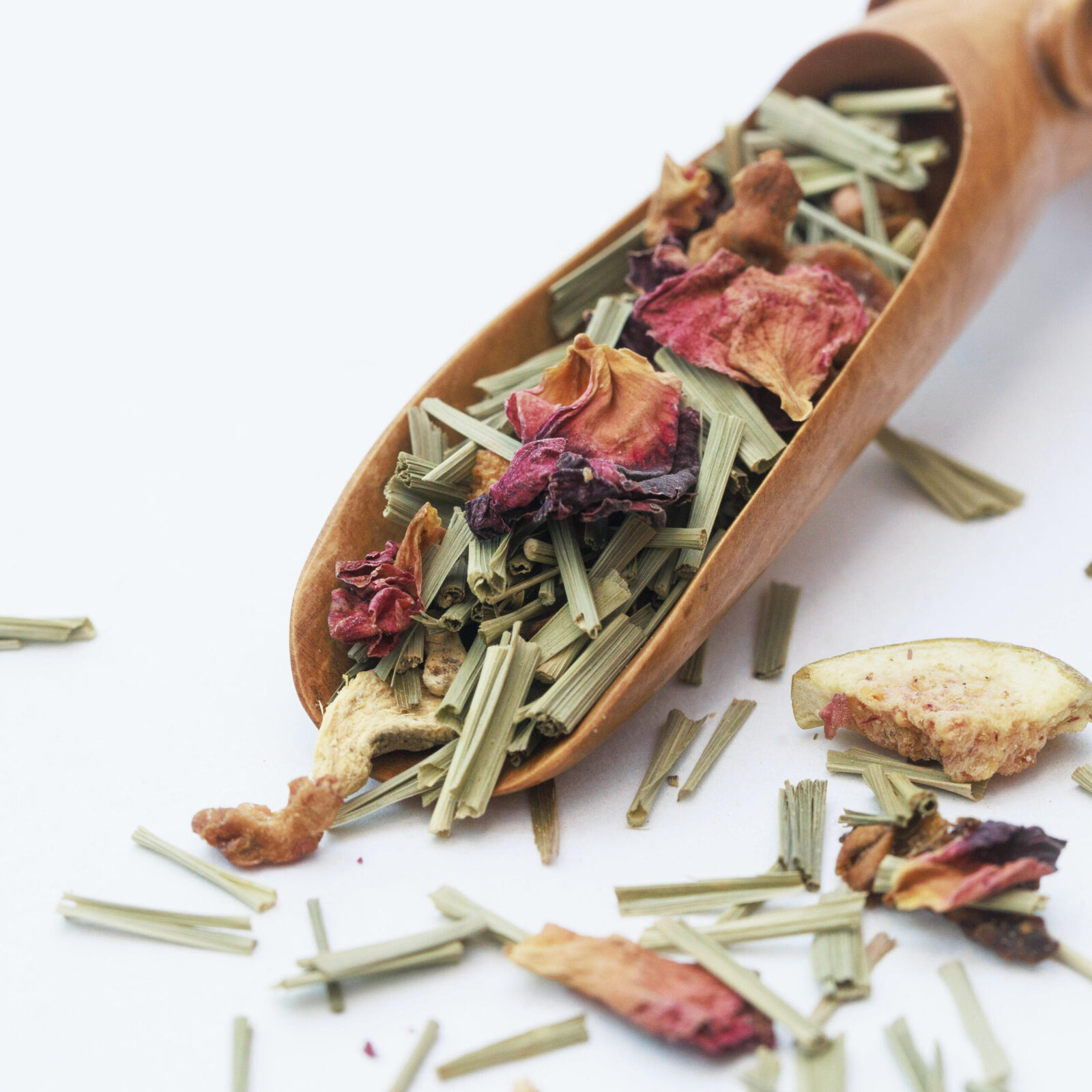 Uues teesegus: sidrunhein, õuna tükid, valged hibiskuse õied, kibuvitsamarja kestad, tulsi, lõhna- ja maitseained, külmkuivad kibuvitsa marjad, maasikad ja mustsõstrad, magusa muraka lehed, buchu lehed.