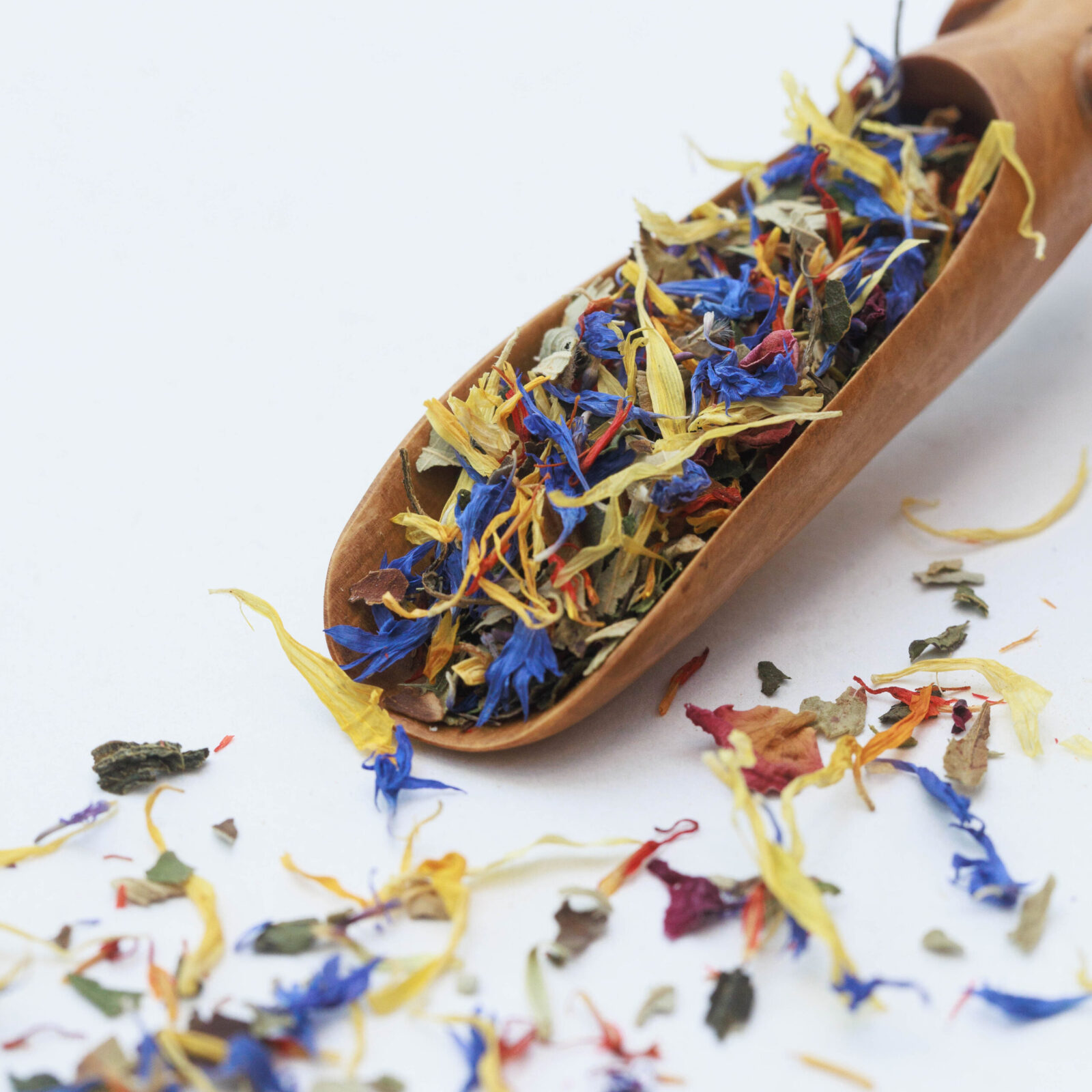 Teesegu milles õuna tükikesed, muraka lehed, värvsafloor, piparmünt, sidrunmürt, kõrvenõges, külmkuivatatud maasikad, rukkilille ja saialille õied, roosi kroonlehed, rosinad, apelsini- ja sidrunikoor.