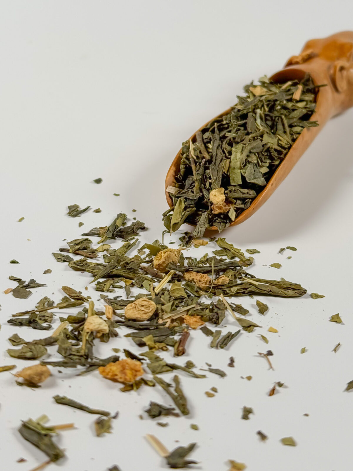Teesegu milles roheline sencha tee, ingverijuur, Moringa lehed, sidrunikoor, sidrunhein, looduslik lõhna- ja maitseaine.