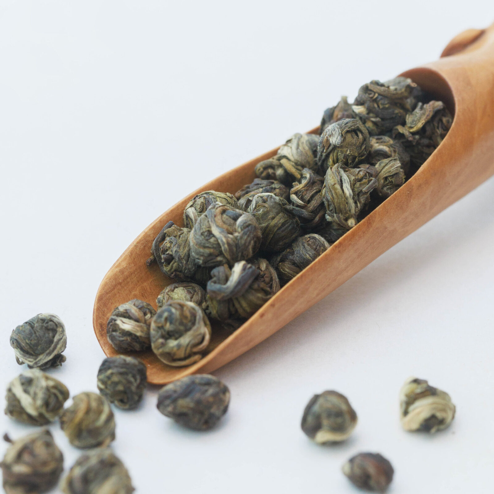 Elegantne ja hõrk, šampanja tooni kõrgema klassi valge tee* Hiina mägedest, Fujiani piirkonnast. Teelehed segatakse õrnade ja aromaatsete jasmiiniõitega* ning rullitakse seejärel käsitsi väikesteks pärliteks.