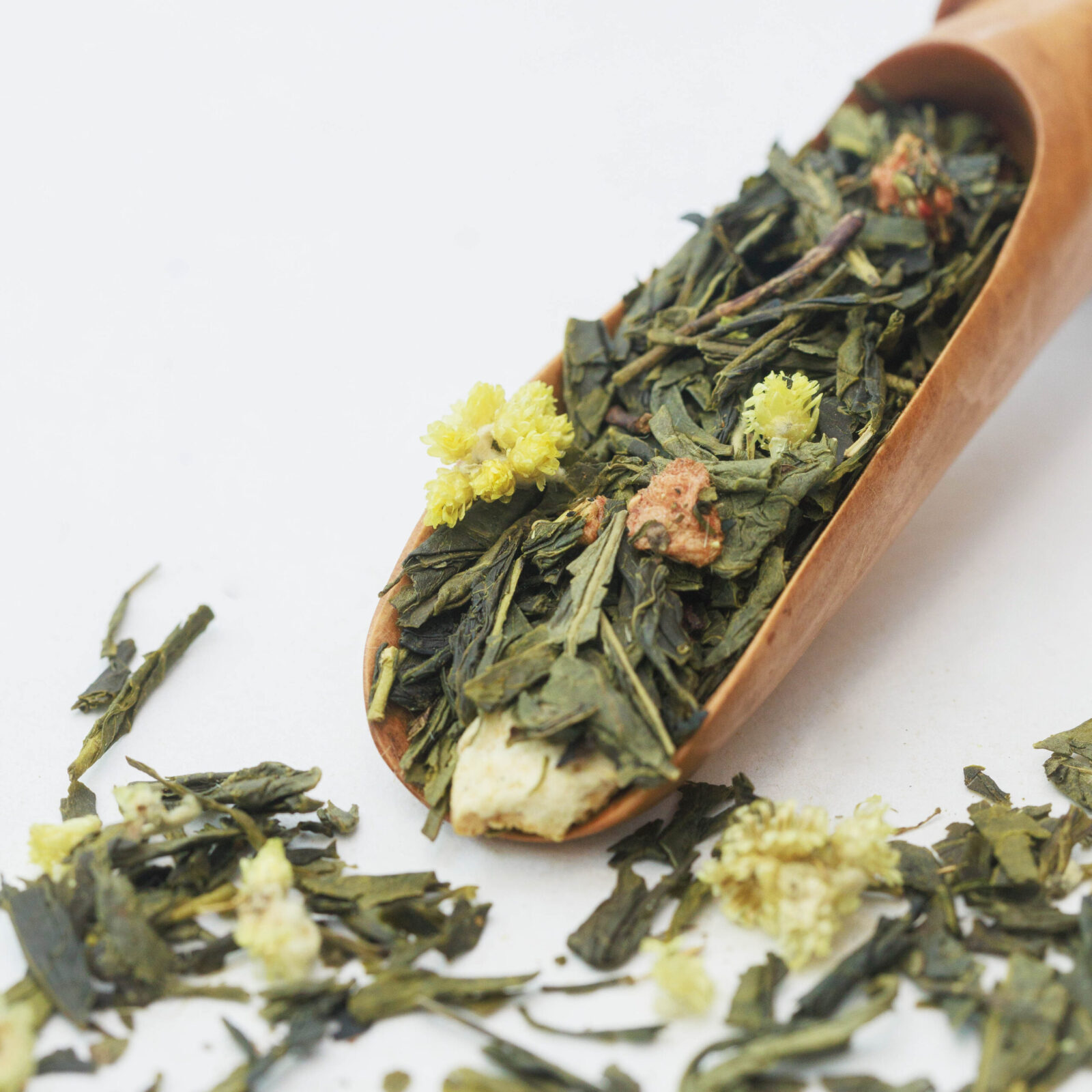 Värske, karge ja maasikane teesegu milles roheline sencha tee, lõhna- ja maitseaine, apelsinikoor, hariliku kassikäpa õied, külmkuivatatud maasika tükikesed.