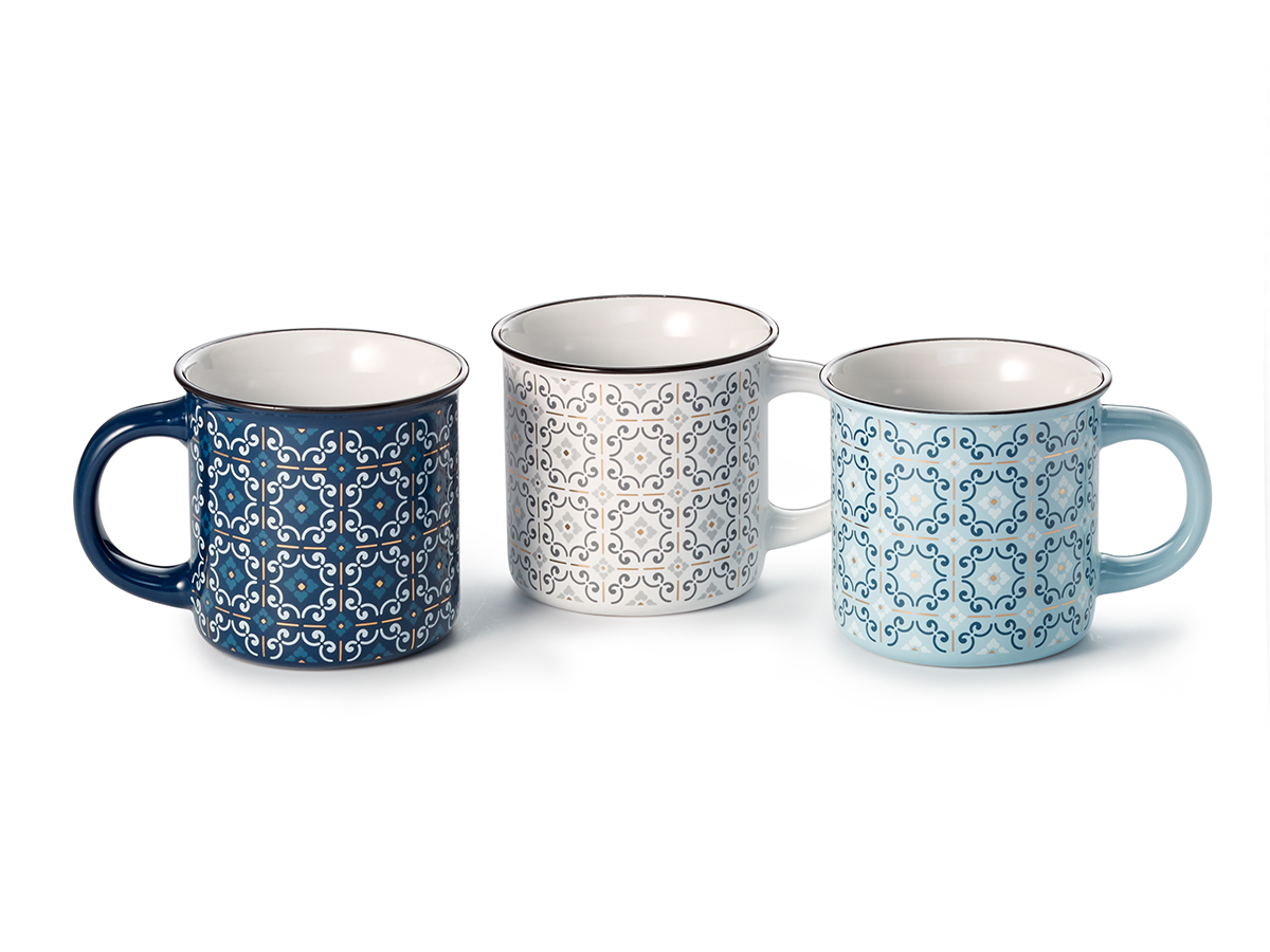 Klassikalist emailkruusi meenutav kivikeraamiline kruus Maroko-pärase kuldse mustriga.