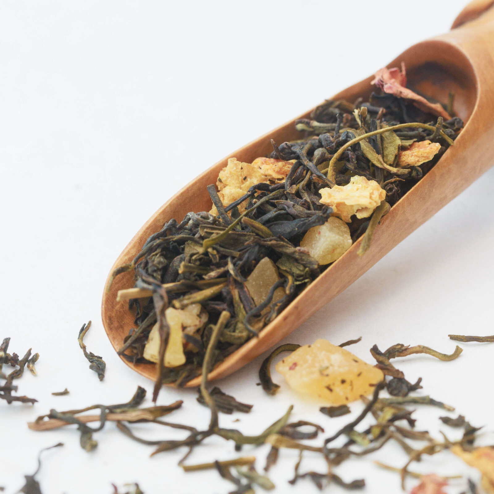 Teesegu milles roheline sencha tee, mango kuubikud (suhkur), sidrunikoor, lõhna- ja maitseaine, mango helbed, külmkuivatatud jogurt (PIIM, suhkur, maltodekstriin, tärklis, sidrunhape), roosi kroonlehed.