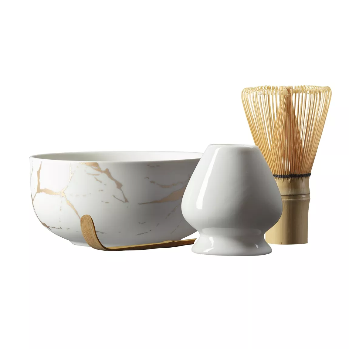 Matcha tee valmistamise komplektis on: keraamiline kullaga kauss (läbimõõt 12 cm, kõrgus 6cm), vispel, vispli hoidja ja chashaku