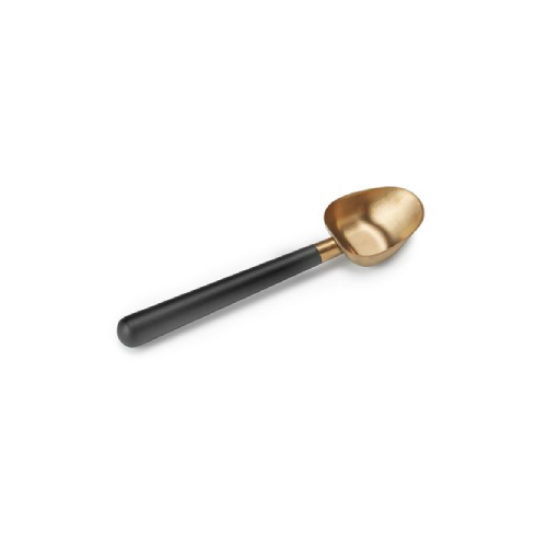 Sügavmust käepide ja elegantne pronksitooni lusikaosa – luksus tee või kohvitoosis.