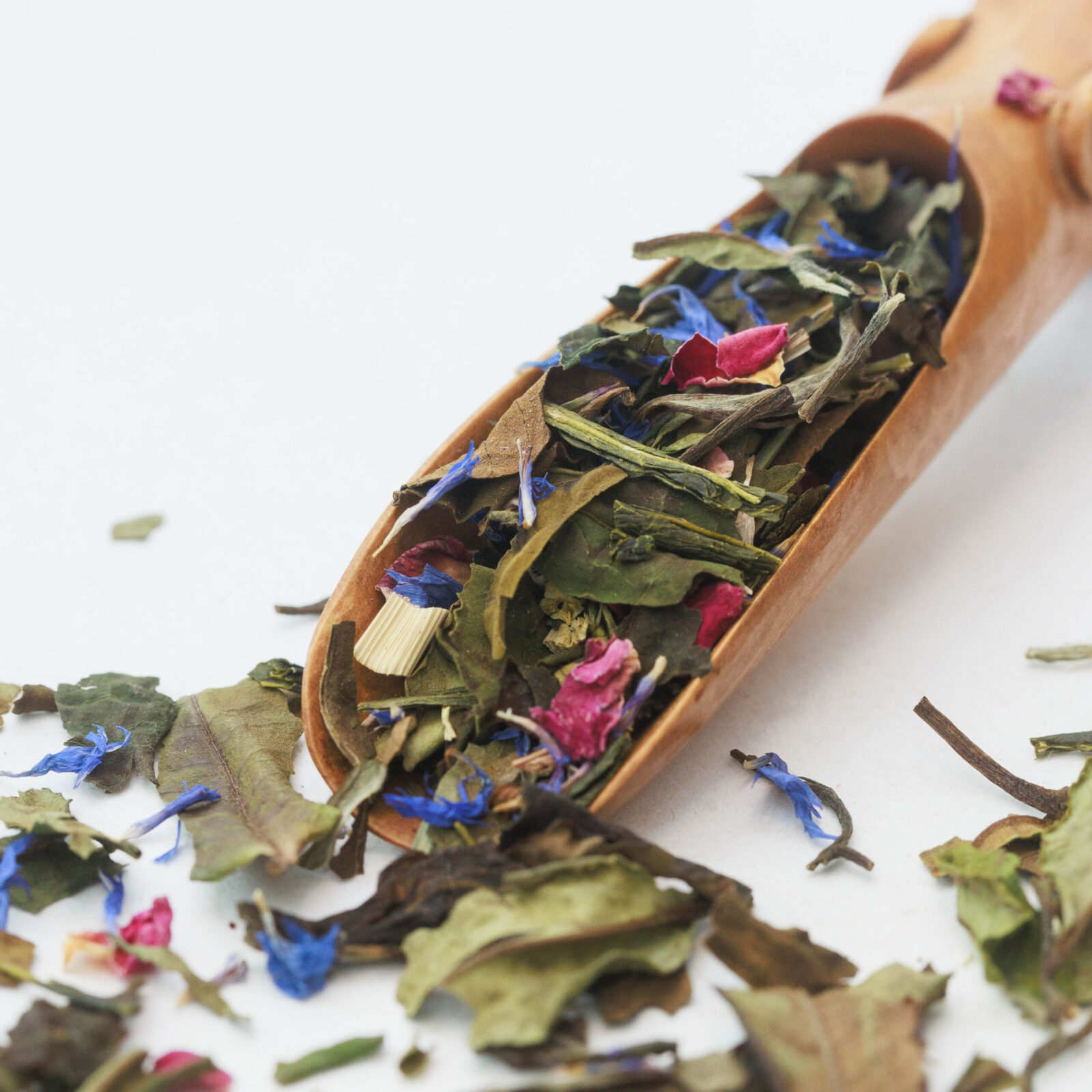 Teesegu milles valge tee Pai Mu Tan, roheline sencha, leedripuu õied, sidrunhein, rukkilille kroonlehed, roosi kroonlehed, lõhna ja maitseaine.