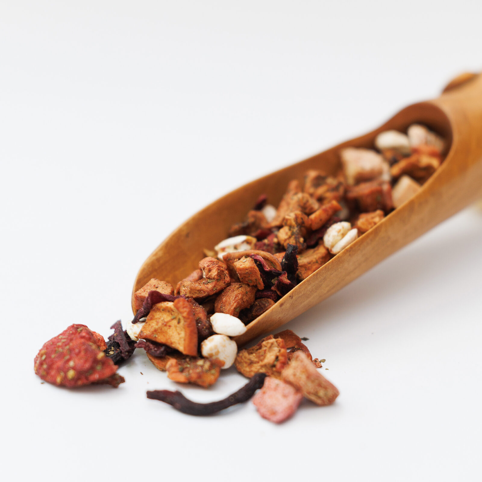 Teesegu milles külmkuivad maasikas ja rabarber, õun, hibiskus, punapeet, tatar, magusa muraka lehed, koorekaramell (magustatud kondensPIIM, suhkur, glükoosisiirup, võiõli, sorbitool, emulgaator: toidurasvhapete mono- ja diglütseriid), lõhna- ja maitseaine.