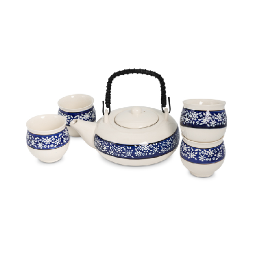 Puidust karbis siniste õitega teekann ja 4 teetopsikest. Teekannus on metallist sõel.